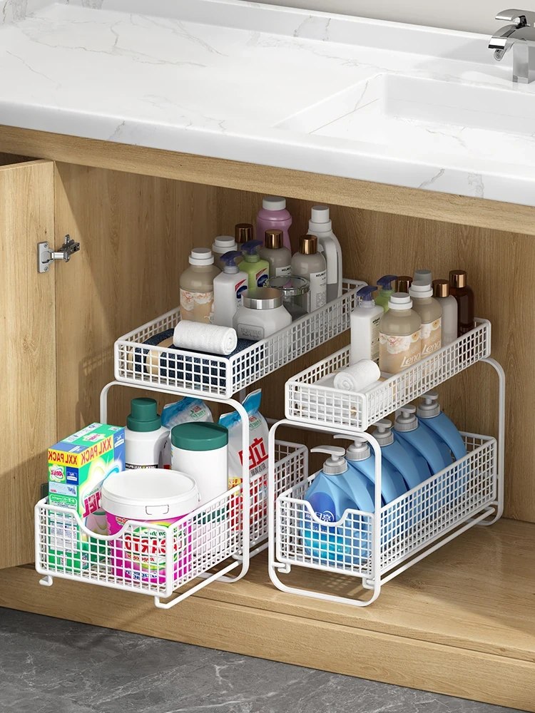 Under-Sink Pull-Out Storage Rack for Bathroom and Kitchen - Multi-Functional Layered Organizer for Sink Cabinets and Vanities - Maximize Space and Keep Essentials Within Reach!