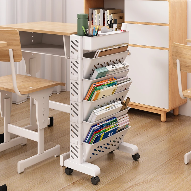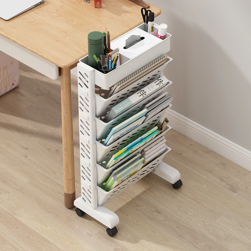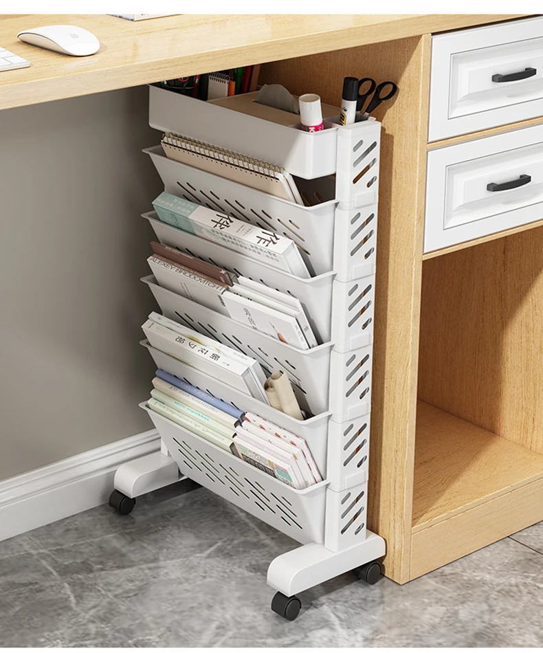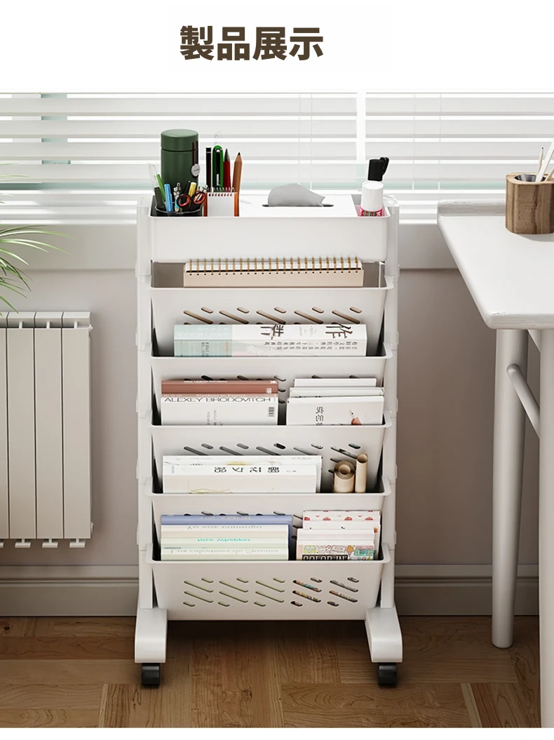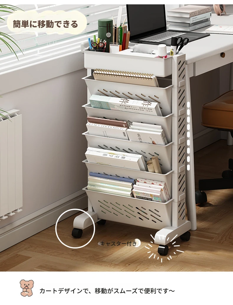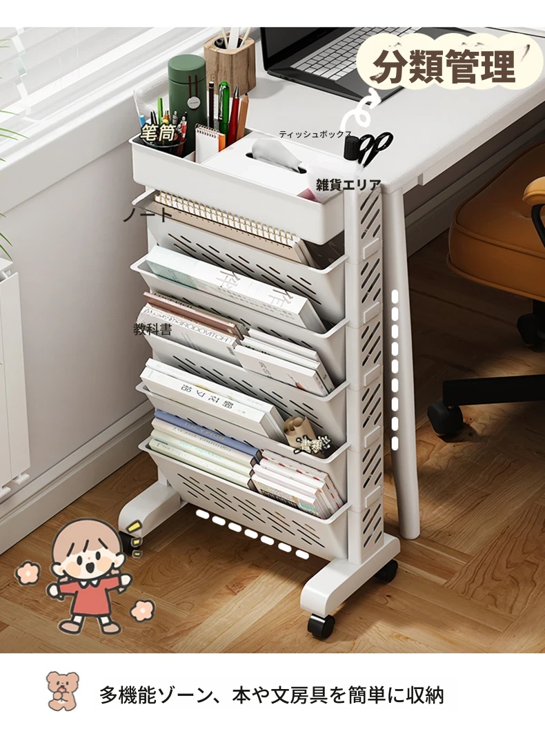 キャスター付き移動式デスクサイド本棚 - 学習空間をスマートに整理!教科書やノートをすっきり収納できる、便利なデザインの書架。高校生にぴったりのアイテム!