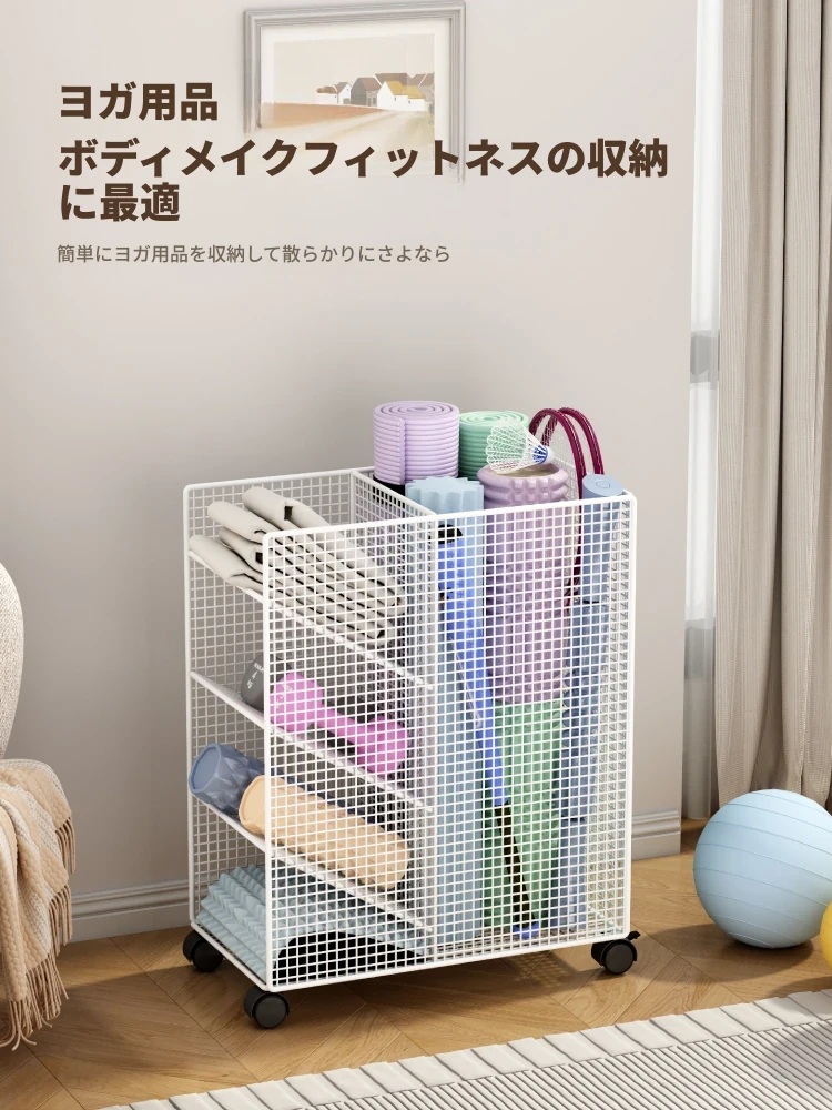 ヨガ収納バスケット|フィットネス器具の整理に最適!家庭用バスケットボール・ダンベル収納バスケット、バドミントンラケットもスッキリ収納できる隙間収納ラック!あなたの運動空間を美しく整えましょう!